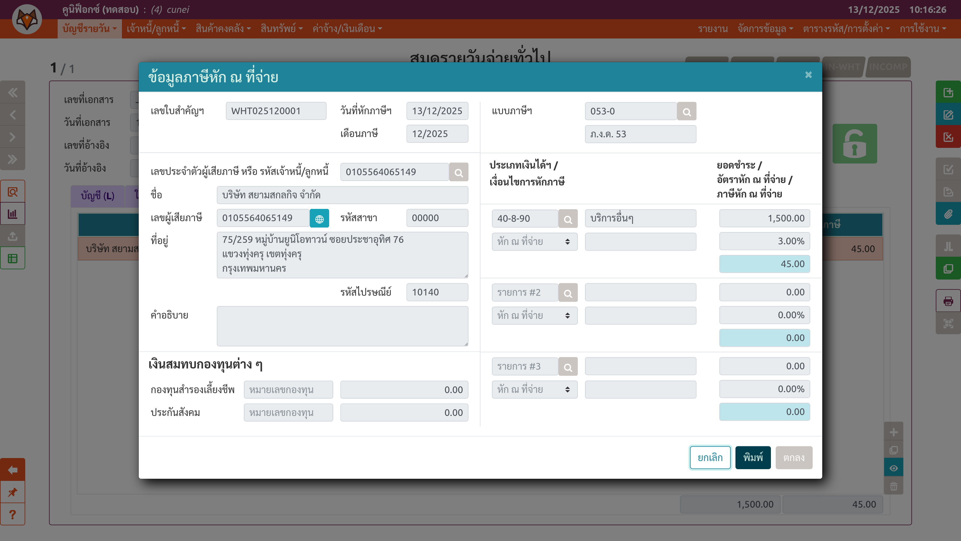 เพจ "บันทึกสมุดบัญชีรายวัน" (ฟอร์มภาษีหัก ณ ที่จ่าย)