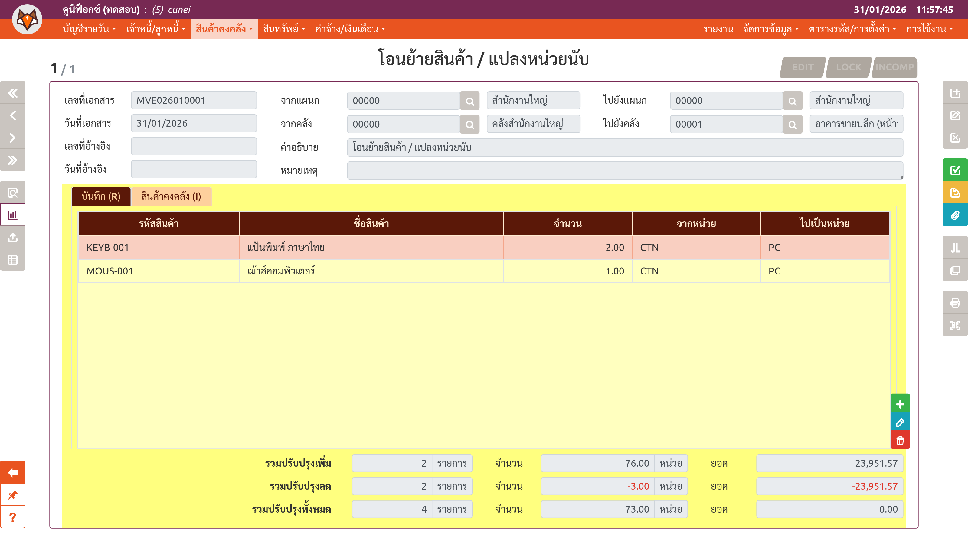 เพจ "โอนย้ายสินค้า / แปลงหน่วยนับ" (ขั้นตอนที่ 2)