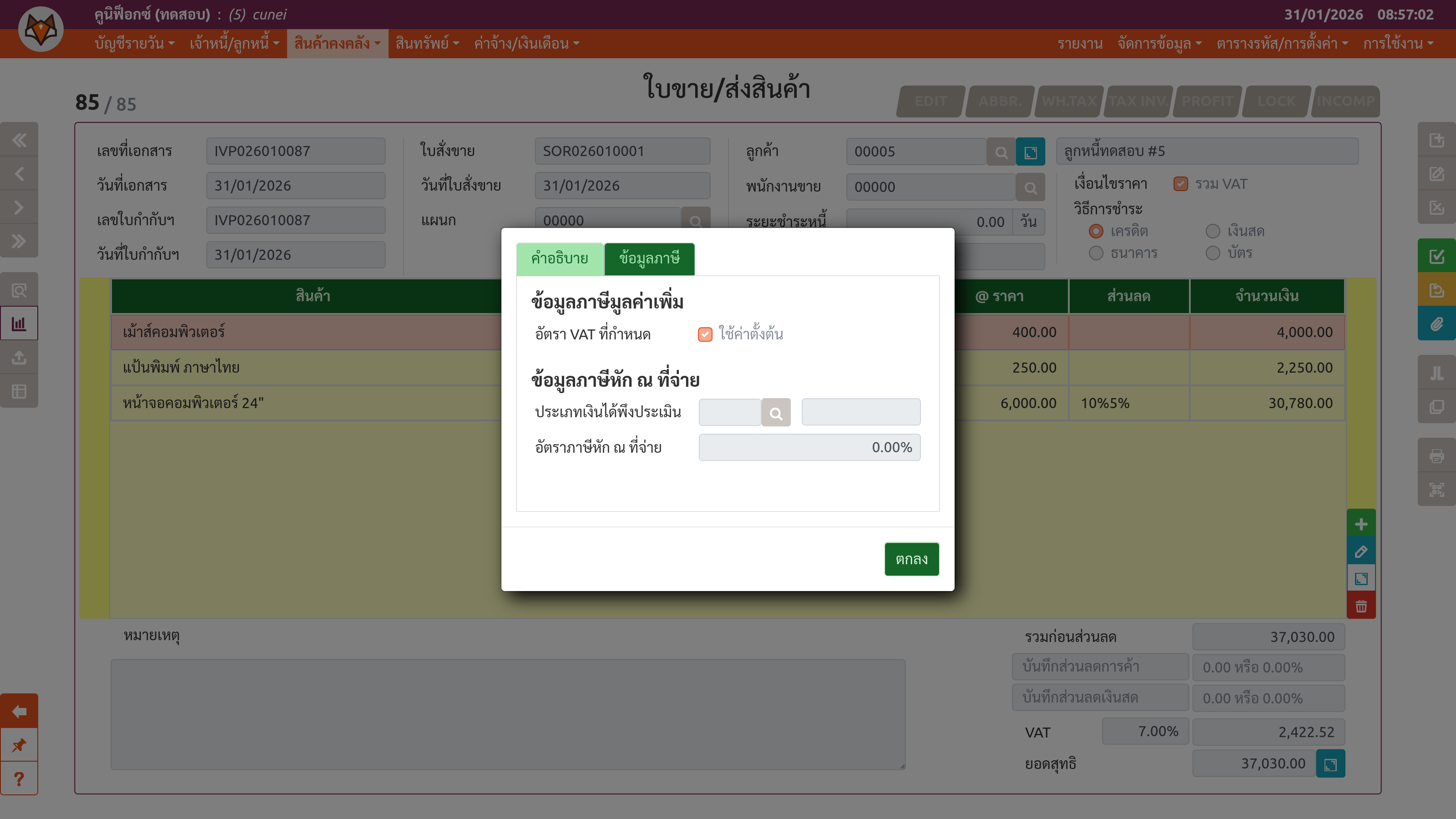 เพจ "ใบขาย/ส่งสินค้า" (ขั้นตอนที่ 3: แท็บ "ข้อมูลภาษี" ของส่วนต่อขยาย)