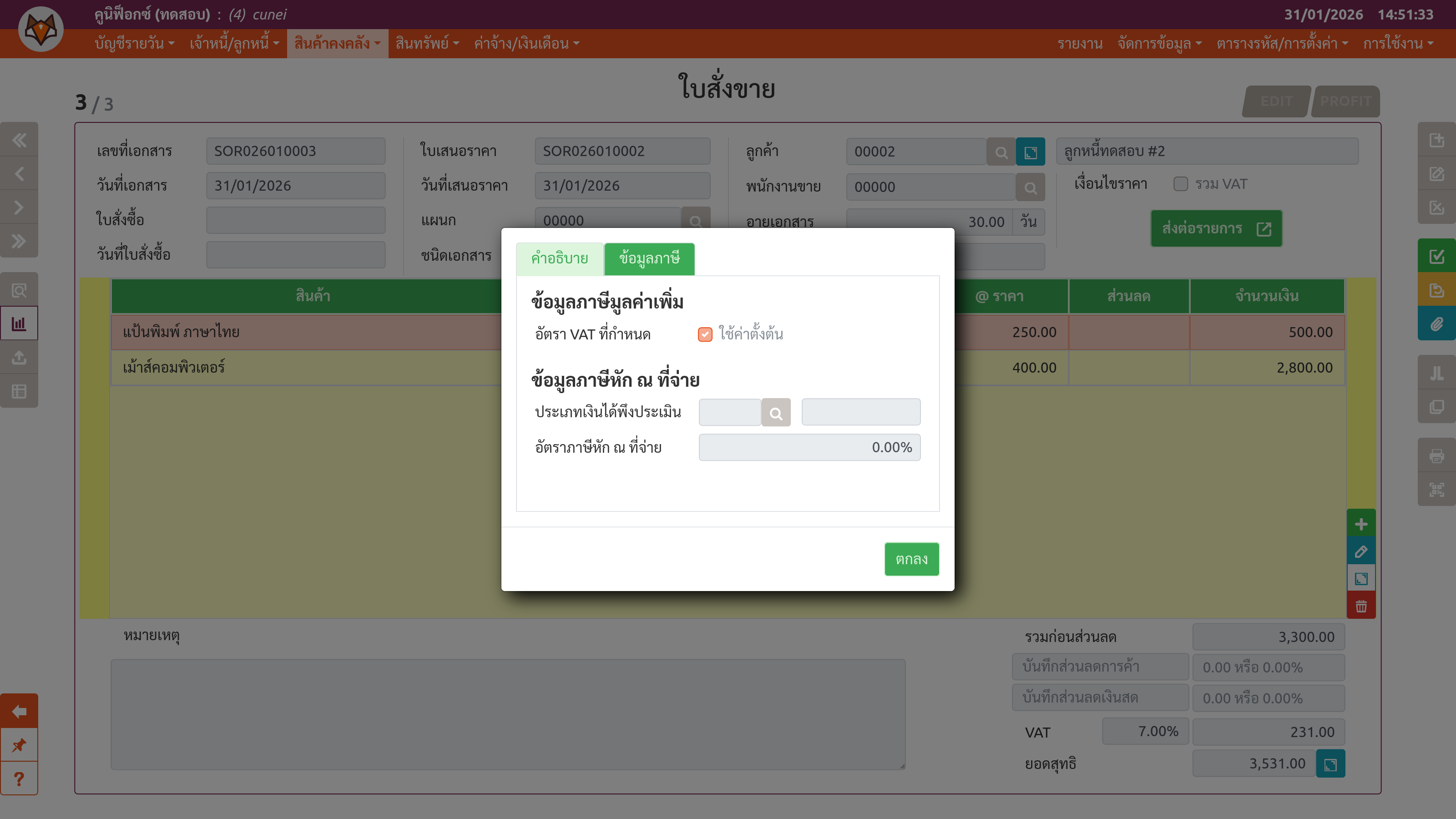 เพจ "ใบสั่งขาย" (ขั้นตอนที่ 3: แท็บ "ข้อมูลภาษี" ของส่วนต่อขยาย)